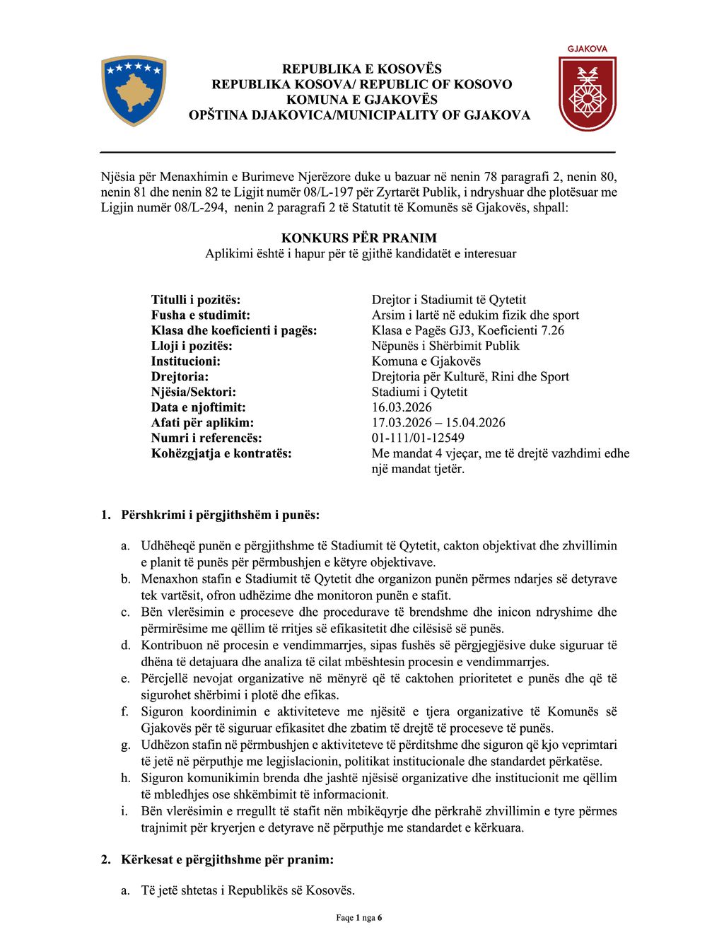 Drejtori i Stadiumit të Qytetit është personi përgjegjës për menaxhimin, organizimin dhe funksionimin e përgjithshëm të stadiumit. Ai/ajo siguron që objekti sportiv të operojë në mënyrë efikase, të jetë i mirëmbajtur dhe i sigurt për sportistët, stafin dhe publikun.